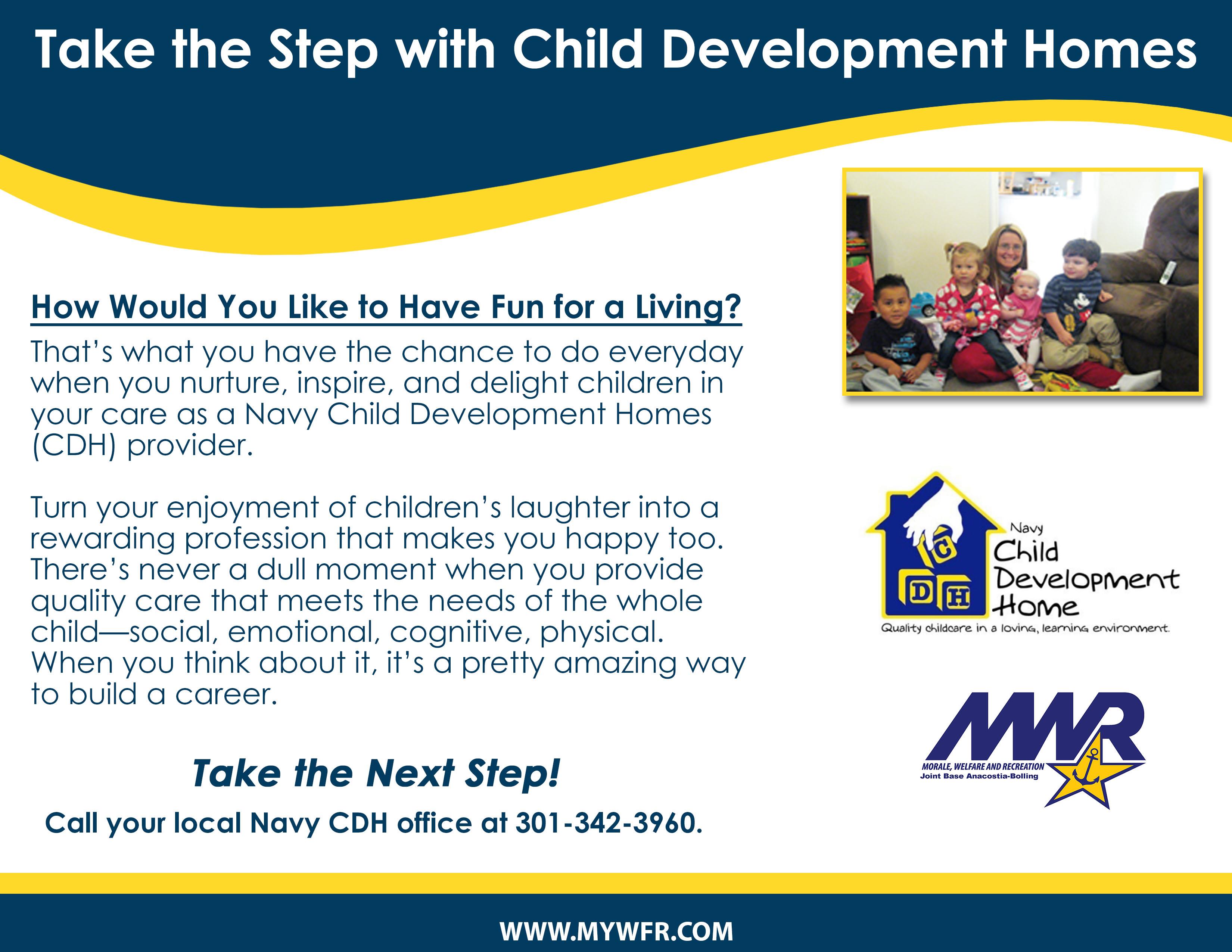 The Navy CDH Program is looking for qualified applicants who would like to work from home and who also has an sincere passion to nurture, love and care for children on Joint Base Anacostia-Bolling. The program is seeking individuals who would like to earn extra income while providing quality child care in their homes. If you don’t mind opening your home up to families, home inspections and background clearances, then the next exciting thing is awaiting for you. All training and certifications are provided free of charge and the potential to earn a great income is only one phone call away, you will become a private contractor and an entrepreneur all at once while running your own day care business. If you think you can make a difference in a child’s life, then please pick up the phone and call to find out more about becoming a Home Day Care Provider.