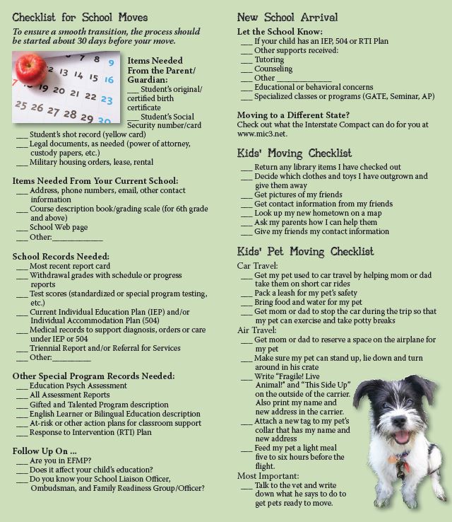 If your family is planning a PCS move, don’t forget to formally withdraw your child(ren) from their school. In most cases, you will receive a withdrawal or transfer packet with important information from your child’s school file that will make it easier to enroll in the new school. For more tips on how to make school transitions as smooth as possible, contact the school liaison officer.